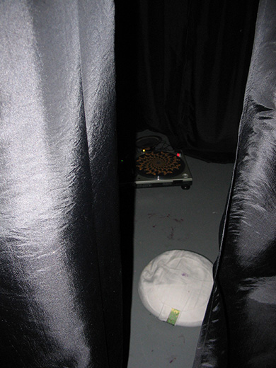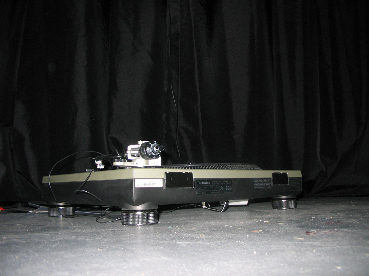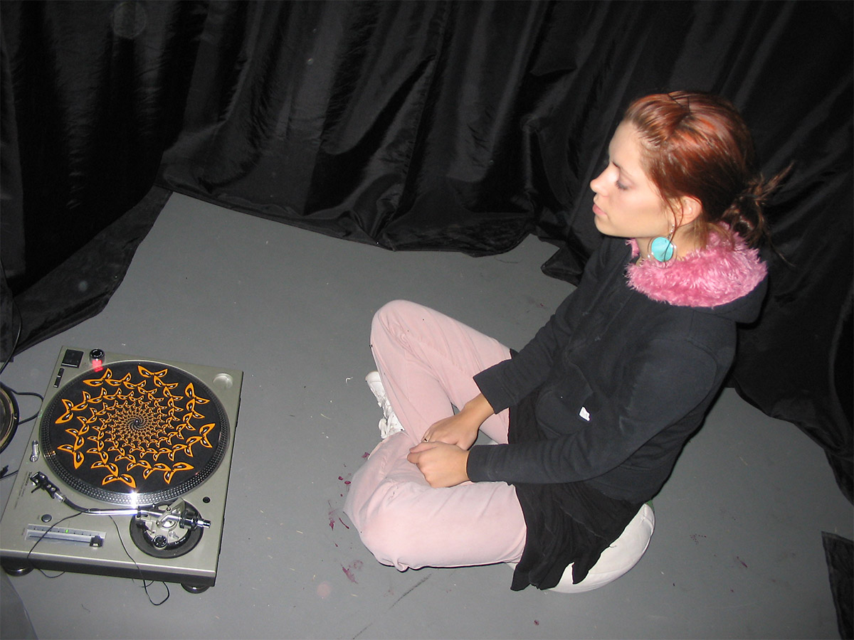 This project is the result of my interaction with the turntable and my own impulse to stare fixedly at a silent, spinning Technics table as an idea of contemplation and meditation. I sat and watched the turntable spin for five hours in a dark atmosphere. Initially I thought to test my limits on the length of time I could focus on a spinning object. As time passed, I became less aware of my surroundings and more focused on my expanding state of consciousness. I became less aware of time and more aware of the brilliance of the lights reflecting from the turntable. It was hypnotic; I entered a deep state.